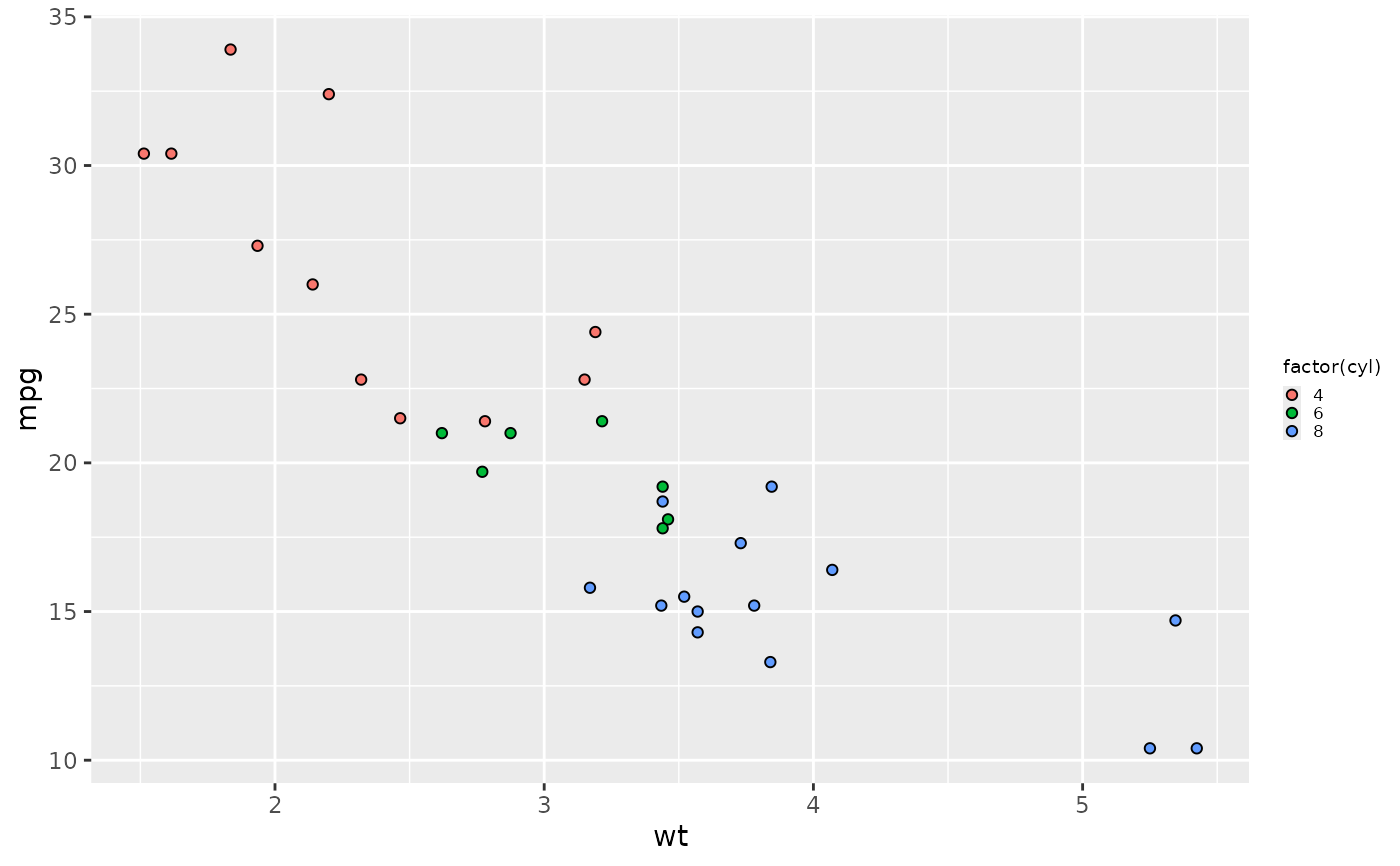 ggplot(mtcars, aes(wt, mpg, fill = factor(cyl))) +